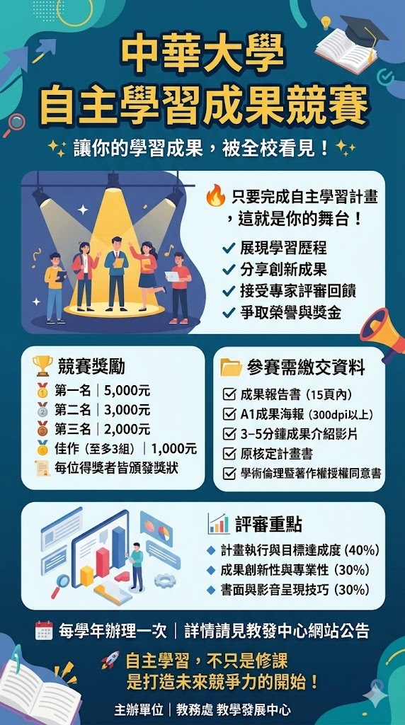 為鼓勵並展現本校學生修習「自主學習」課程之學習成果,舉辦「自主學習競賽」,提供通過自主學習課程計畫之學生團隊發表學習歷程、創新思維與實踐成果之平台,並透過跨組觀摩與專家回饋,深化學生獨立思考、系統規劃與問題解決等核心素養,落實學用合一之教育目標。